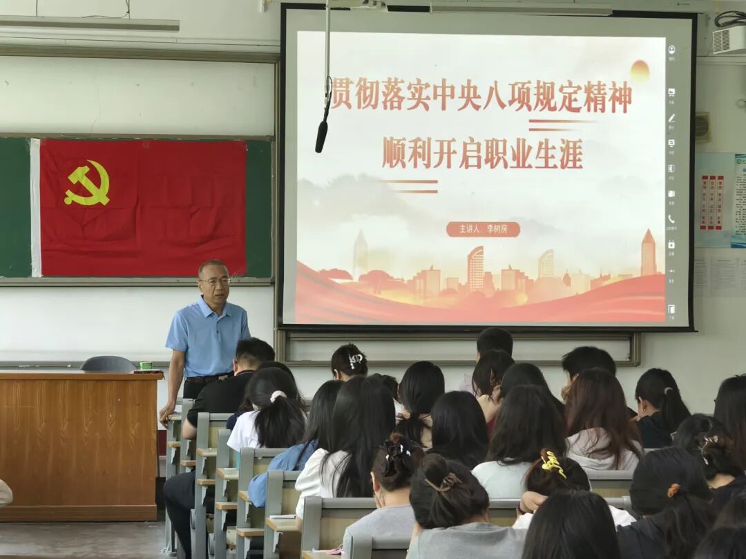 6月15日,565net必赢官方网党委副书记、副院长李树房为学院2025届毕业生党员作了题为《贯彻落实中央八项规定精神 顺利开启职业生涯》的学习教育专题党课。
