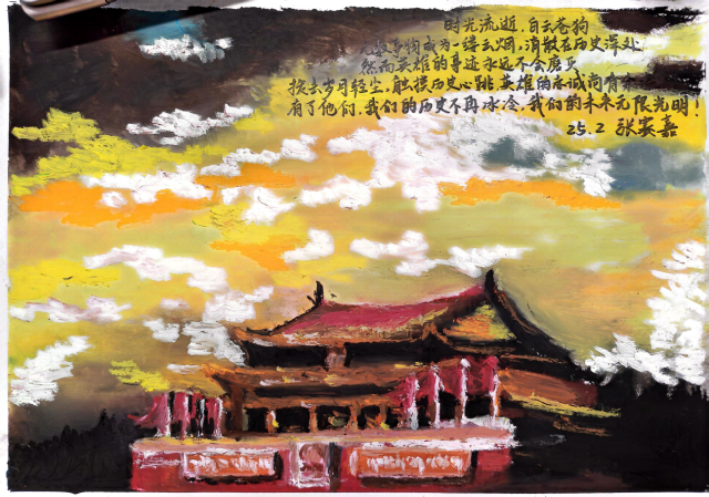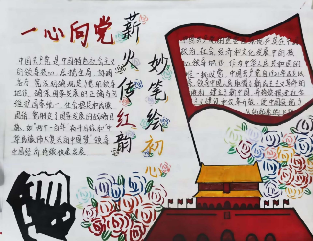 同学们紧扣“富国强国”核心主题,以情怀为笔、感悟为墨,用斑斓色彩勾勒情感温度,从多元视角挥洒创作灵感:手抄报上,天安门檐角高挑着国旗的炽红,商院学子以笔为针,把“富国”初心细细绣进笔墨肌理;画作里,红旗漫卷过中华人民共和国成立初期的熹微晨光,也映照着新时代的璀璨星河。笔墨间既承伟人之志,又绘强国盛景,一颗红心照亮奋进征程。这方寸天地间的一抹红,是青春与家国相撞的滚烫回响,更是青年一代捧给时代的赤诚答卷。