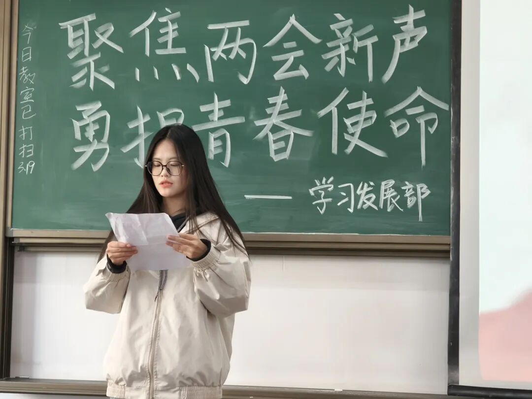 孔鑫瞳借助文案与视频,清晰地为同学们梳理了两会的主要议程与重要成果,并带领大家深入解读了两会核心精神,从国家发展战略到民生福祉改善,全方位地剖析了两会传递出的关键信息。此外,他着重阐述了如何用青春践行两会精神,鼓励同学们立足当下,努力学习专业知识,积极投身社会实践,以实际行动响应两会号召。