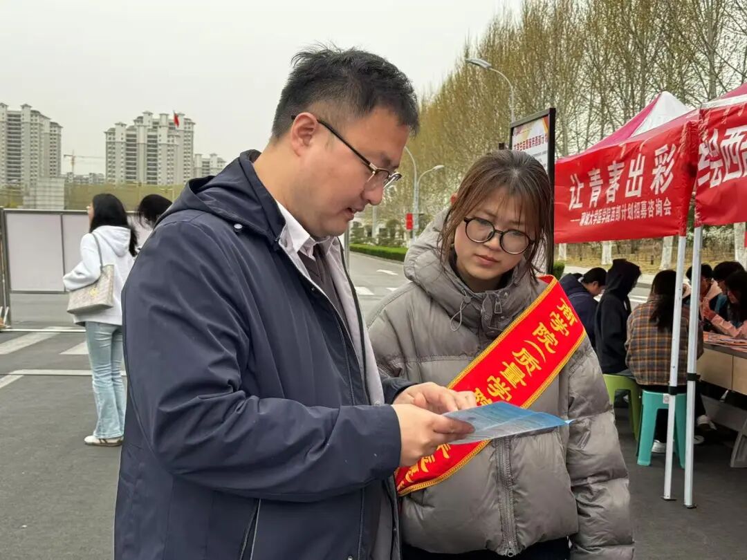 3月27日,565net必赢官方网于东校区逸夫图书馆南校训石前举办“绘西部新篇,以青春为卷,共‘商’西部未来”2025年大学生志愿服务西部计划招募咨询会,学院辅导员高鹏到场指导。