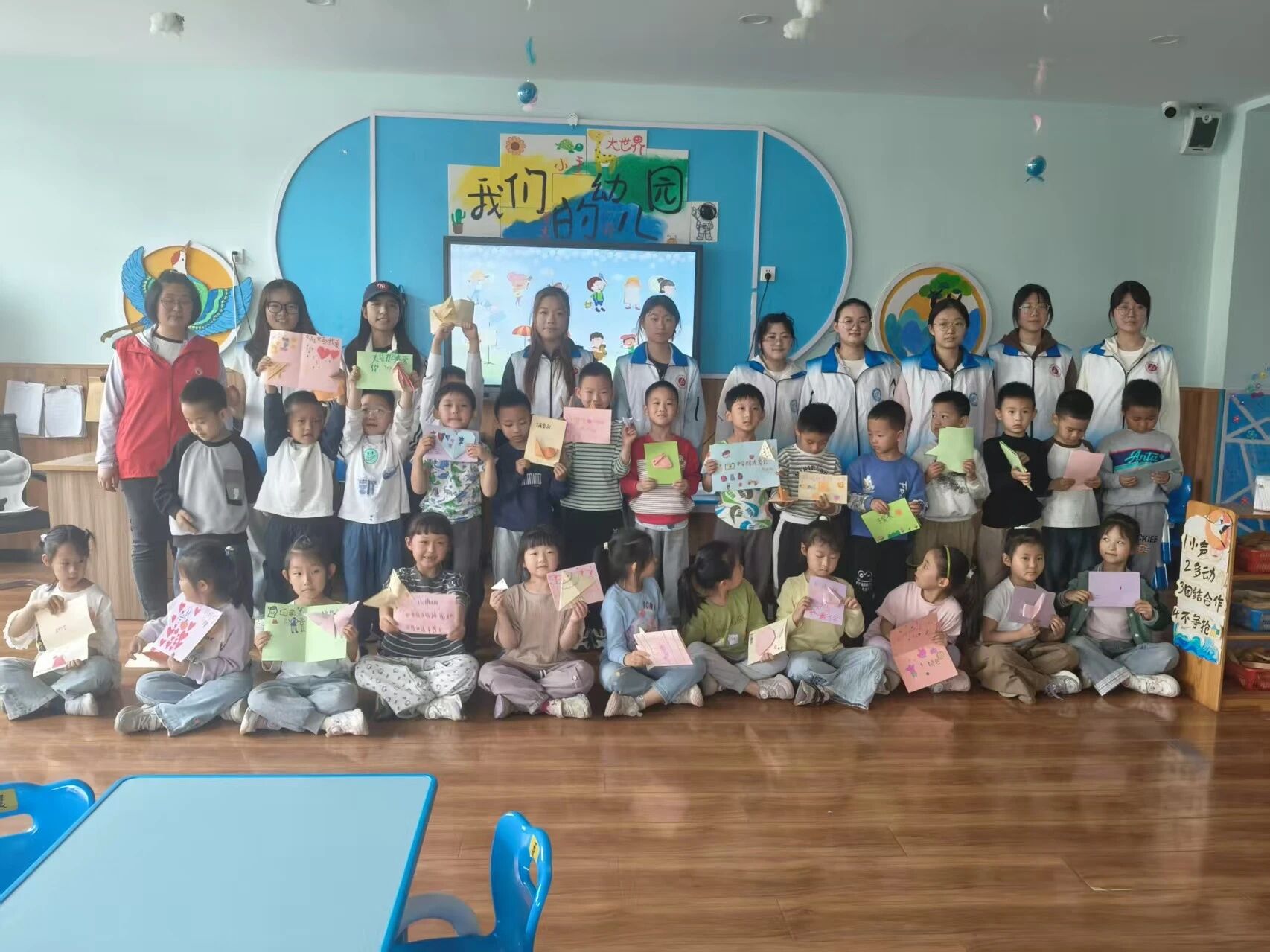 活动从“溯源母亲节”文化讲堂启幕,志愿者借助生动活泼的动画演示,用童趣化语言向孩子们讲解了母亲节的起源与发展。孩子们认真聆听,积极互动,现场不时响起阵阵欢声笑语,在轻松愉快的氛围中感受母爱的伟大与母亲节的深厚文化内涵。实践环节中,志愿者带领幼儿制作创意感恩贺卡,彩色卡纸、亮片贴纸等材料铺满活动室。小朋友们或专注描绘简笔画,或灵巧折叠立体纸艺,并在此基础上用拼音认真书写祝福语。经过一个多小时的创作,百余张满载童心的贺卡顺利完成,既有童趣盎然的彩虹图案,也有立体浮雕效果的“妈妈我爱你”字样设计。