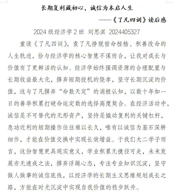 学院活动以《了凡四训》为共读书目,线上共读环节中,学生们分组展开热烈讨论,从《了凡四训》“命自我立、改过迁善、谦德修身”的核心思想出发,结合自身学习状态畅所欲言:有人剖析“立命之学”中“自主规划”的重要性,反思自己在学业中缺乏目标、被动学习的问题;有人对照“改过之法”,梳理出拖延、上课走神、错题不总结等学习陋习的改进思路;还有人从“谦德之效”中领悟到,在小组合作、学业交流中保持谦逊才能更好地取长补短。大家各抒己见,在思想的碰撞中深化了对书籍的理解,也拉近了彼此的距离。全院学生线上参与共读后,纷纷执笔撰写观后感,让经典智慧通过文字沉淀为学业成长的内在动力。