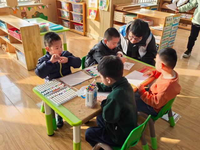 活动现场,伴随着轻快的旋律,志愿者积极示范动作,引导小朋友们开展节气儿歌律动活动,在互动中初步建立对“二十四节气”的认知框架。在此基础上,志愿者向小朋友们分发画纸与彩笔,引导孩子们绘制“春分纸鸢”“冬至饺子”等节气代表图案,并在此过程中结合图案讲解“春分昼夜平分”“冬至数九寒天”等自然知识与民俗故事,让抽象的节气文化转化为可感知的趣味内容。