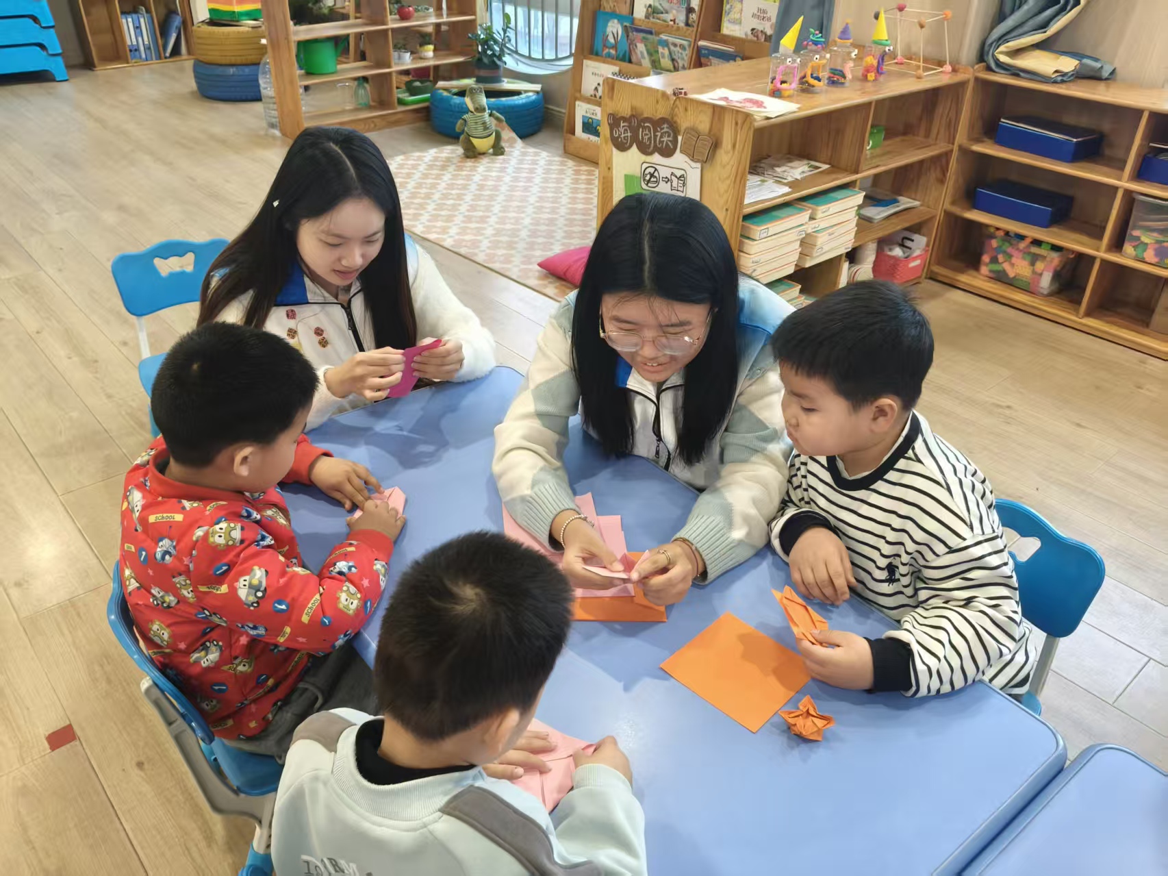 志愿者以互动提问的形式开展暖场环节,围绕澳门相关常识向幼儿提问在充分调动孩子们参与积极性的基础上,结合简化版澳门回归历史绘本,用浅显易懂、贴合幼儿认知的语言,清晰讲述澳门回归的历史背景与发展历程,并手工制作环节中开展分组教学,手把手指导孩子们制作“莲花”主题手工作品,带领幼年儿童逐句学习《七子之歌》手势舞,并用镜头记录下孩子们认真参与的温馨瞬间。